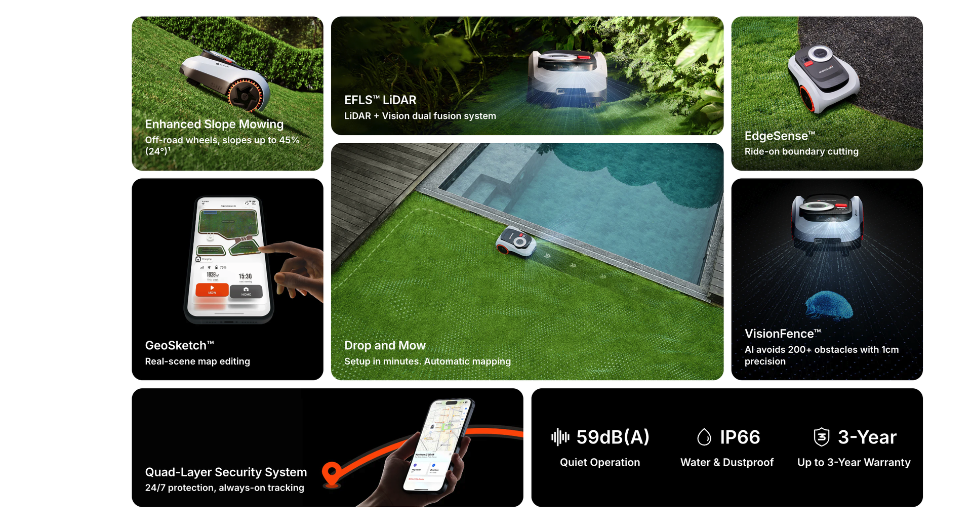 - LiDAR + Vision dual system for flawless navigation, even under trees or at night.